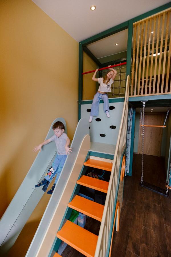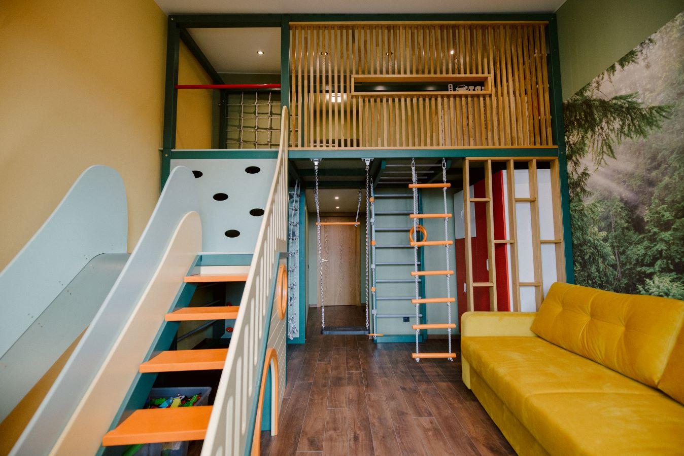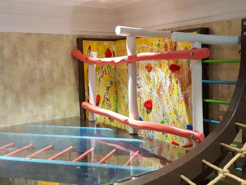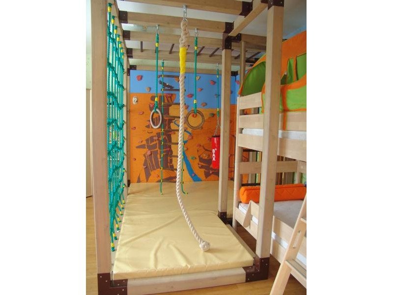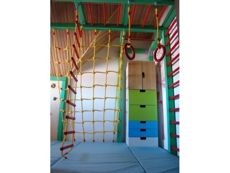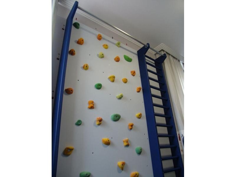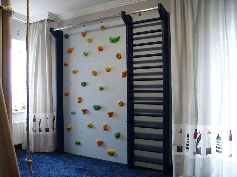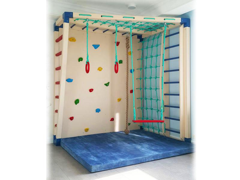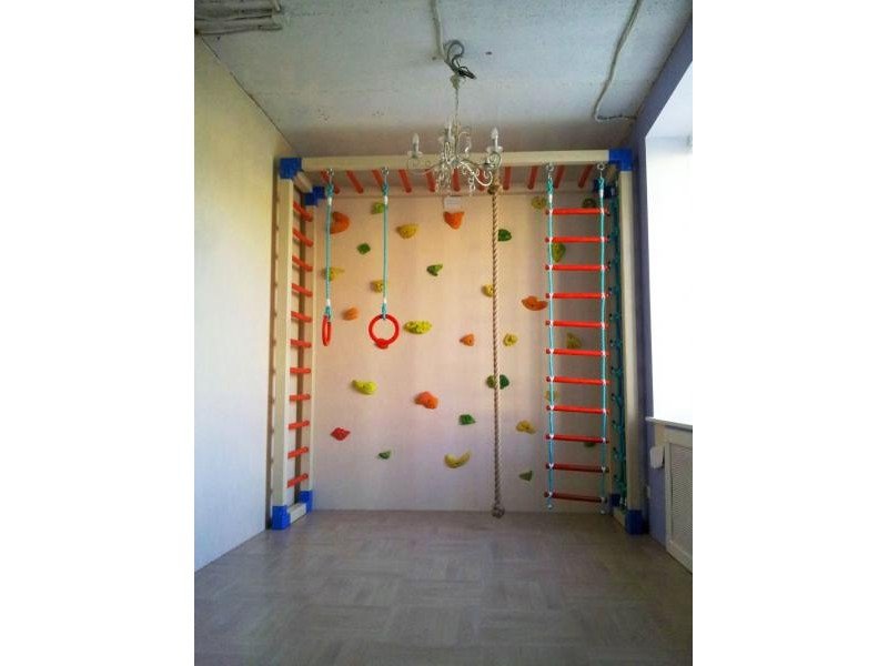 Детские площадки для квартиры могут быть похожи на лаконичный гимнастический зал или вольер для мартышек… Если надо, то потолок будет небом, а паркет газоном. Воображайте дорогие взрослые, оглядывая пока еще пустую комнату, предназначенную для детской. Полистайте журналы, загляните в интернет, посетите зоопарк… Потом звоните нам. Уж мы то развернемся на славу.