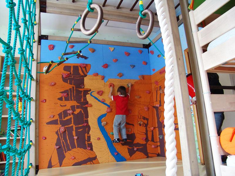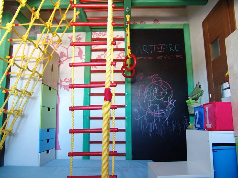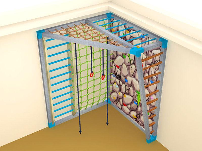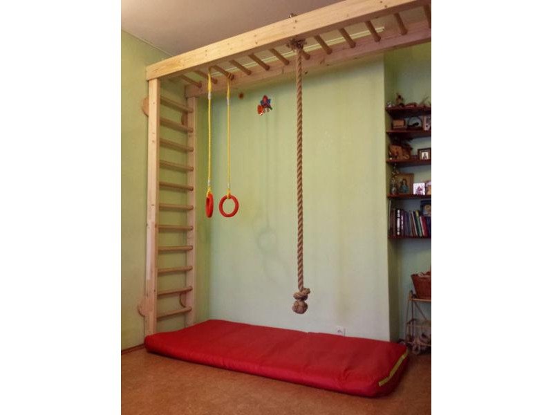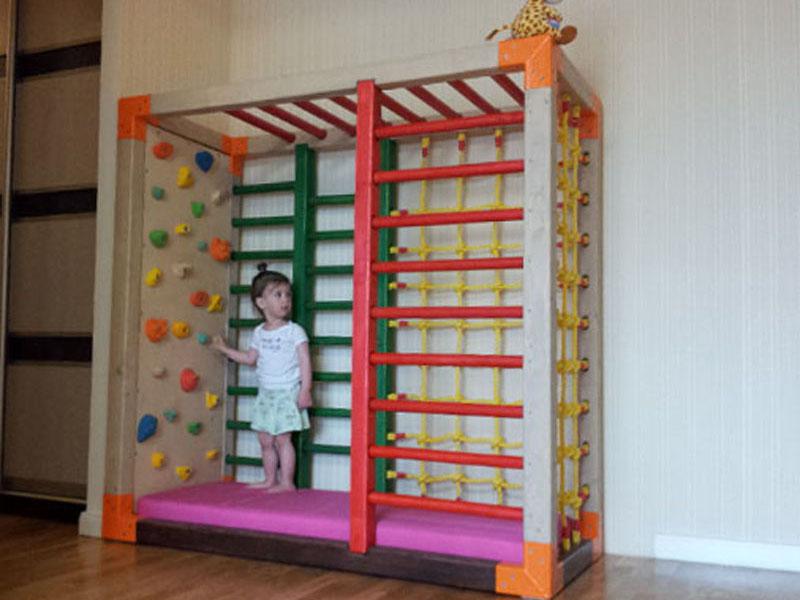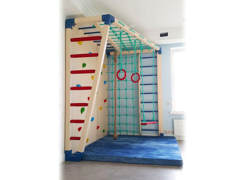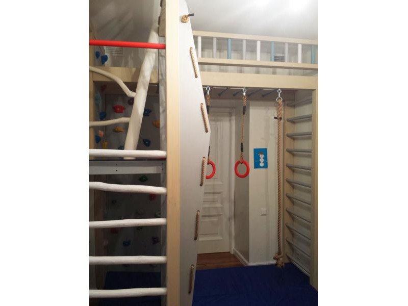 Детские площадки для квартиры могут быть похожи на лаконичный гимнастический зал или вольер для мартышек… Если надо, то потолок будет небом, а паркет газоном. Воображайте дорогие взрослые, оглядывая пока еще пустую комнату, предназначенную для детской. Полистайте журналы, загляните в интернет, посетите зоопарк… Потом звоните нам. Уж мы то развернемся на славу.